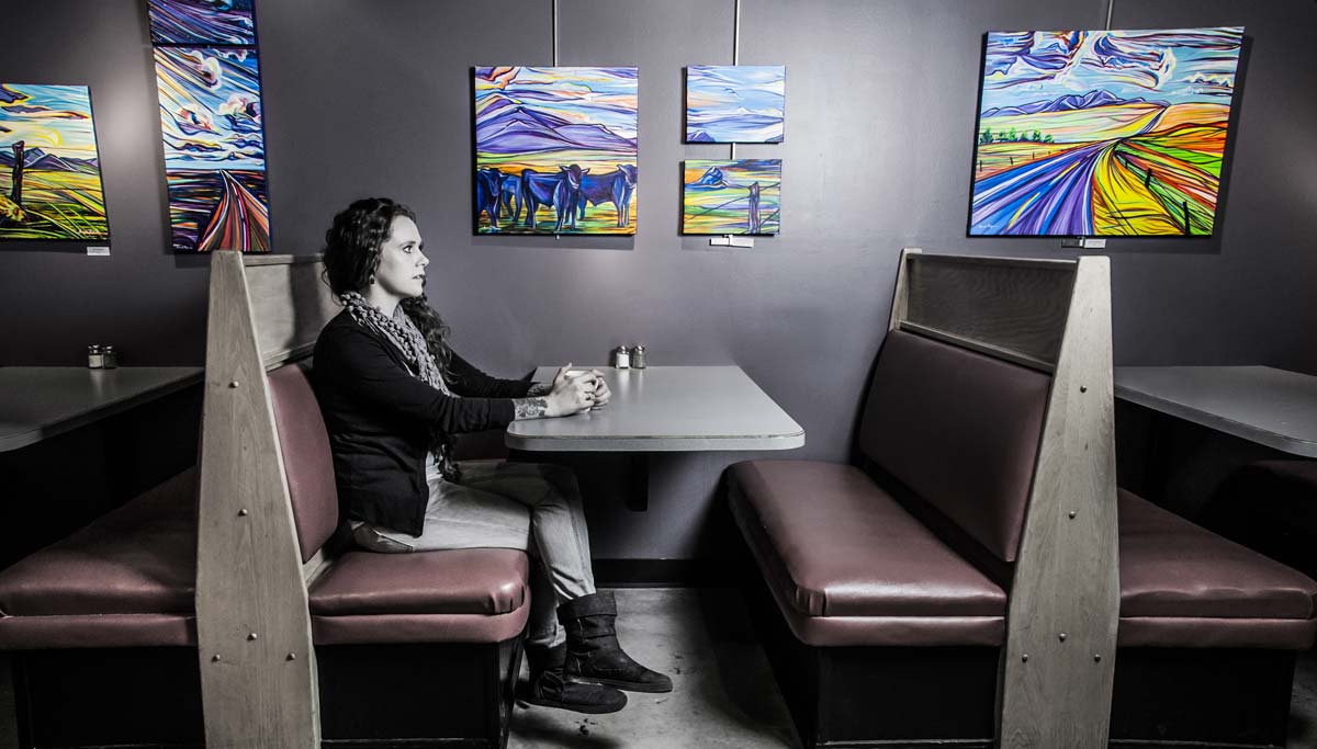 Sarah was 15 when she finished her first painting, which currently hangs in her best friend’s kitchen. “Hopefully she can sell it and retire someday,” Sarah said with a sly grin. A charming 26-year-old and Billings native, Sarah’s charisma stems from her intensely personal nature. She surrounds herself with the things that bring her happiness—friends, music, and art. Her smile is contagious, her curly hair charismatic, and when she paints, all that personality pours onto the canvas.